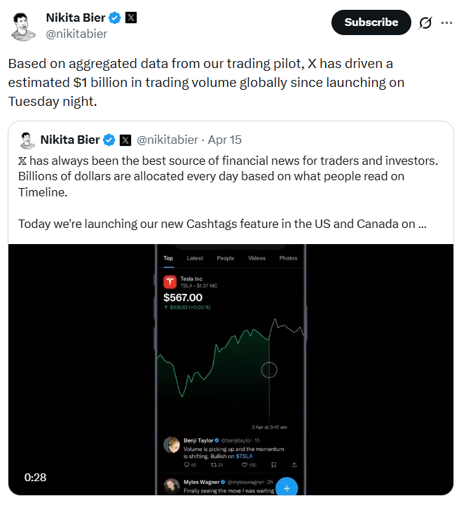 On words According to Nikita Bira, head of product development at X, since the launch of the Cashtags pilot project on April 14, trading volume on the X platform has reached a staggering $1 billion.