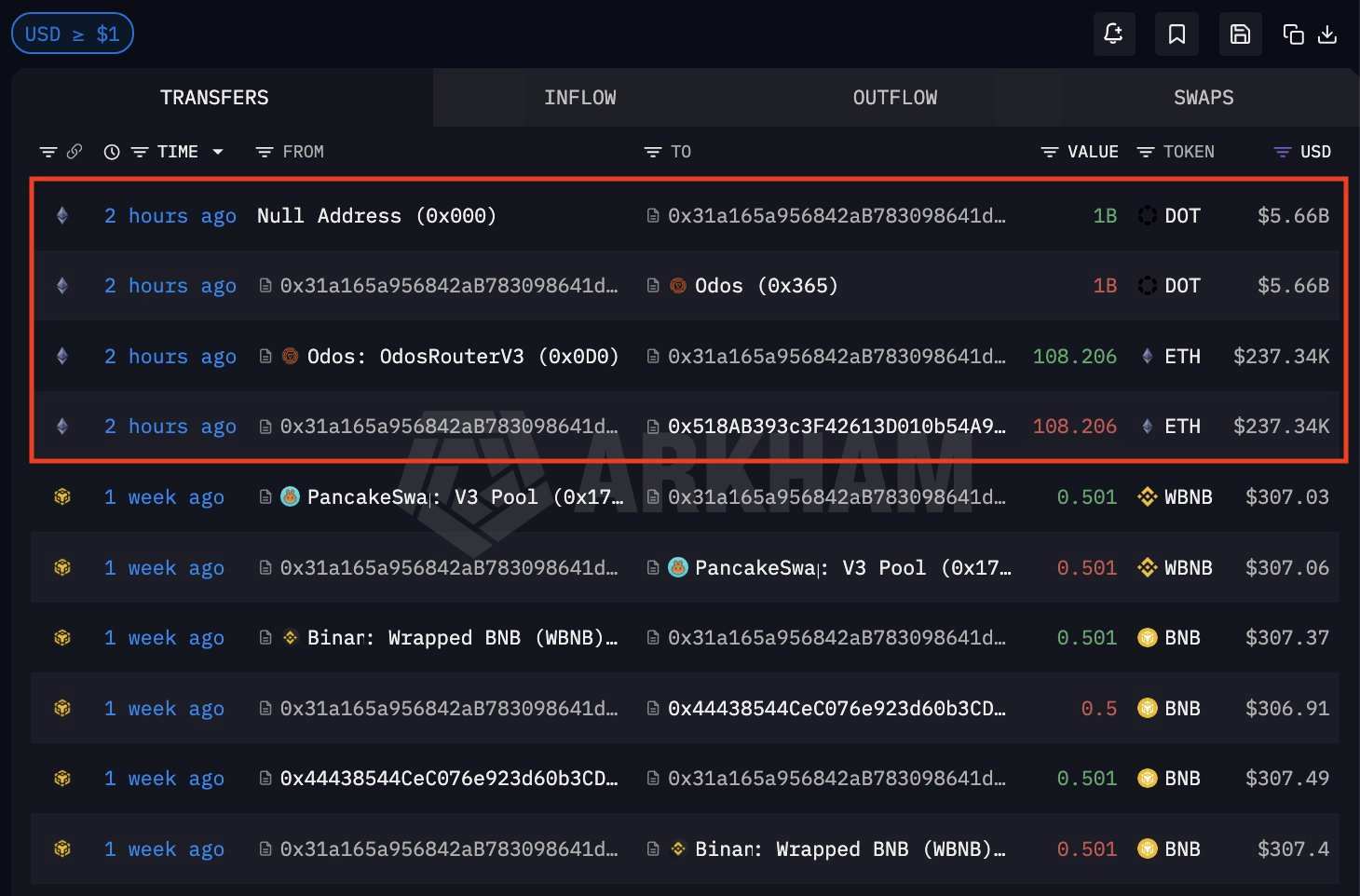 Arkham specialists сообщилиthat an unknown attacker created a billion DOTs on Ethereum and sold them directly through liquidity poolThis allowed him to withdraw more than $240,000 in ETH. Lookonchain analysts confirmed the fact of hacking and the attacker’s net gain, which amounted to $23,000 (108,2 ETH).
