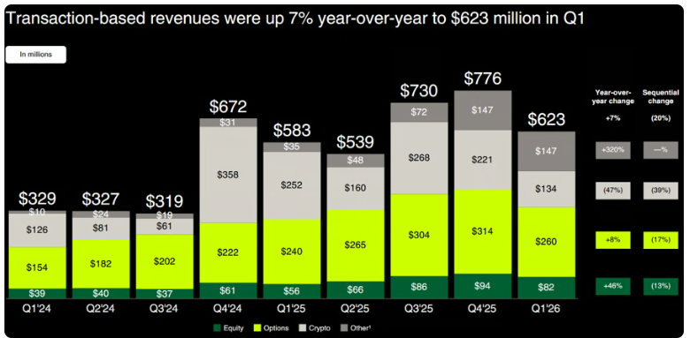 Согласно отчёту компании о доходах за первый квартал 2026 года, выручка Robinhood от криптовалютных транзакций упала на 47% в годовом исчислении с $252 млн до $134 млн, а объём криптовалютной торговли за тот же период сократился на 48% до $24 млрд.