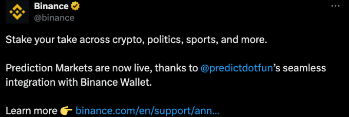 Команда Binance заявила, что запустит в своём приложении рынки прогнозов в рамках интеграции с платформой Predict.fun. Известно, что биржа будет оплачивать комиссии за сделки и расчёты в сети BNB Smart Chain.