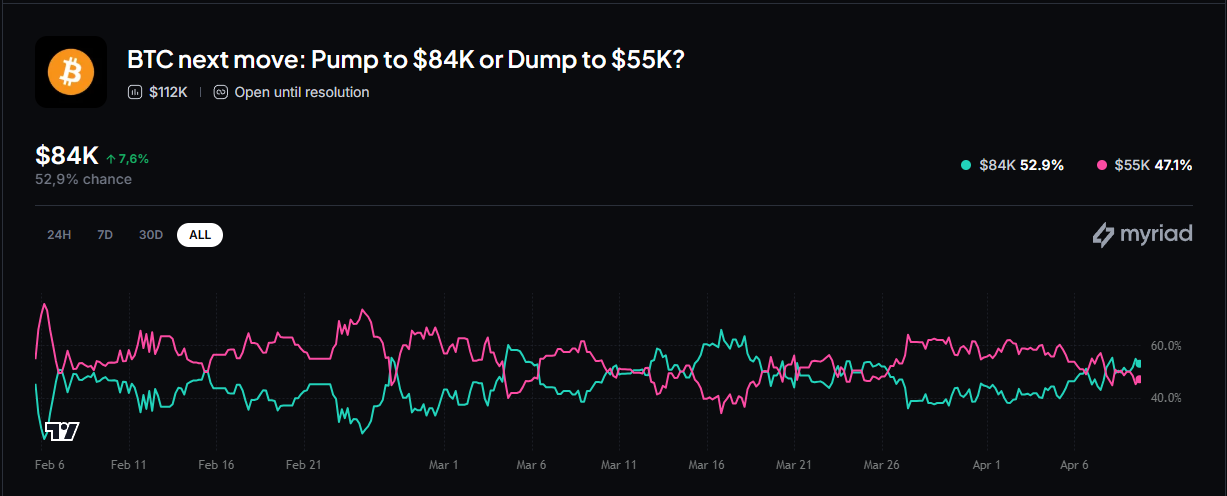 The Myriad platform has a separate market tracks, what level will it reach? Bitcoin First, $84,000 or $55,000. The probability of the two outcomes is almost equal: the bullish scenario is estimated at 51,6% versus 52%, and the bearish scenario with $55,000 is estimated at about 48% versus 48,4%.