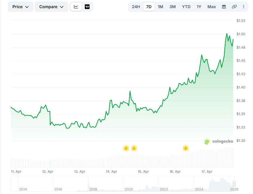 Поскольку американские спотовые ETF на базе XRP зарегистрировали приток денежных средств, цена токена восстановилась. За последние семь дней цена XRP выросла более чем на 9,24%, торгуясь в пятницу по $1,48. В результате рыночная капитализация токена увеличилась до $91,1 млрд.