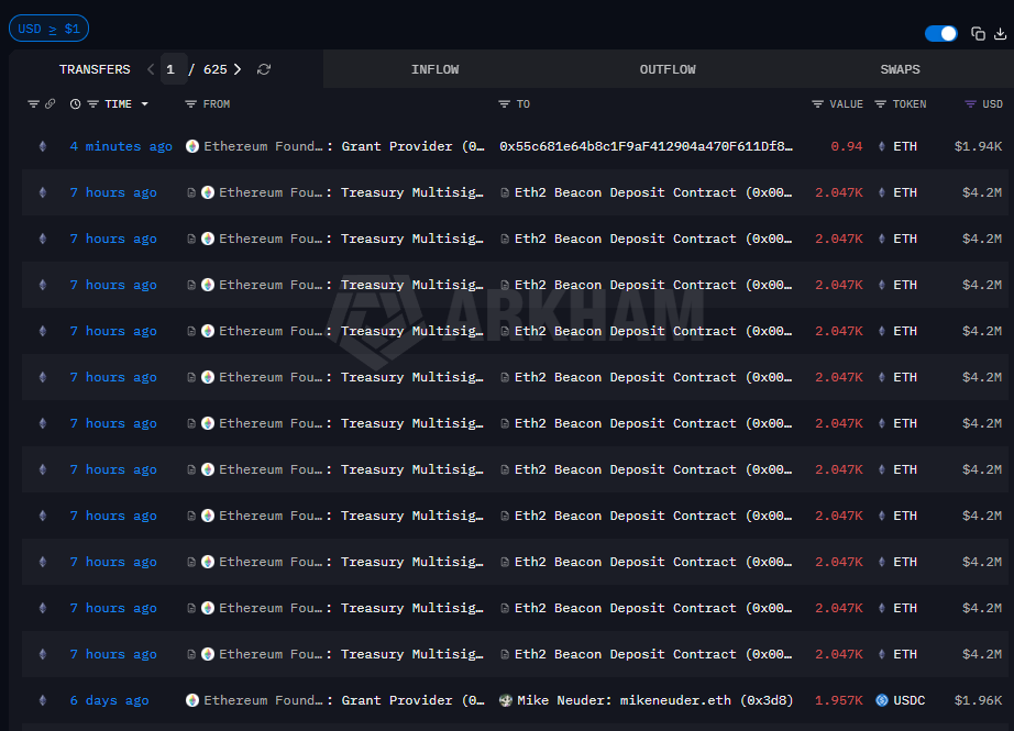 On According to Arkham Intelligence, on Monday, March 30, 22,517 ETH were sent from the foundation’s treasury wallet to an address designated as the ETH2 Beacon deposit contract. The recipient wallet is smart contract on Ethereum, which stakes ETH on the Beacon Chain.
