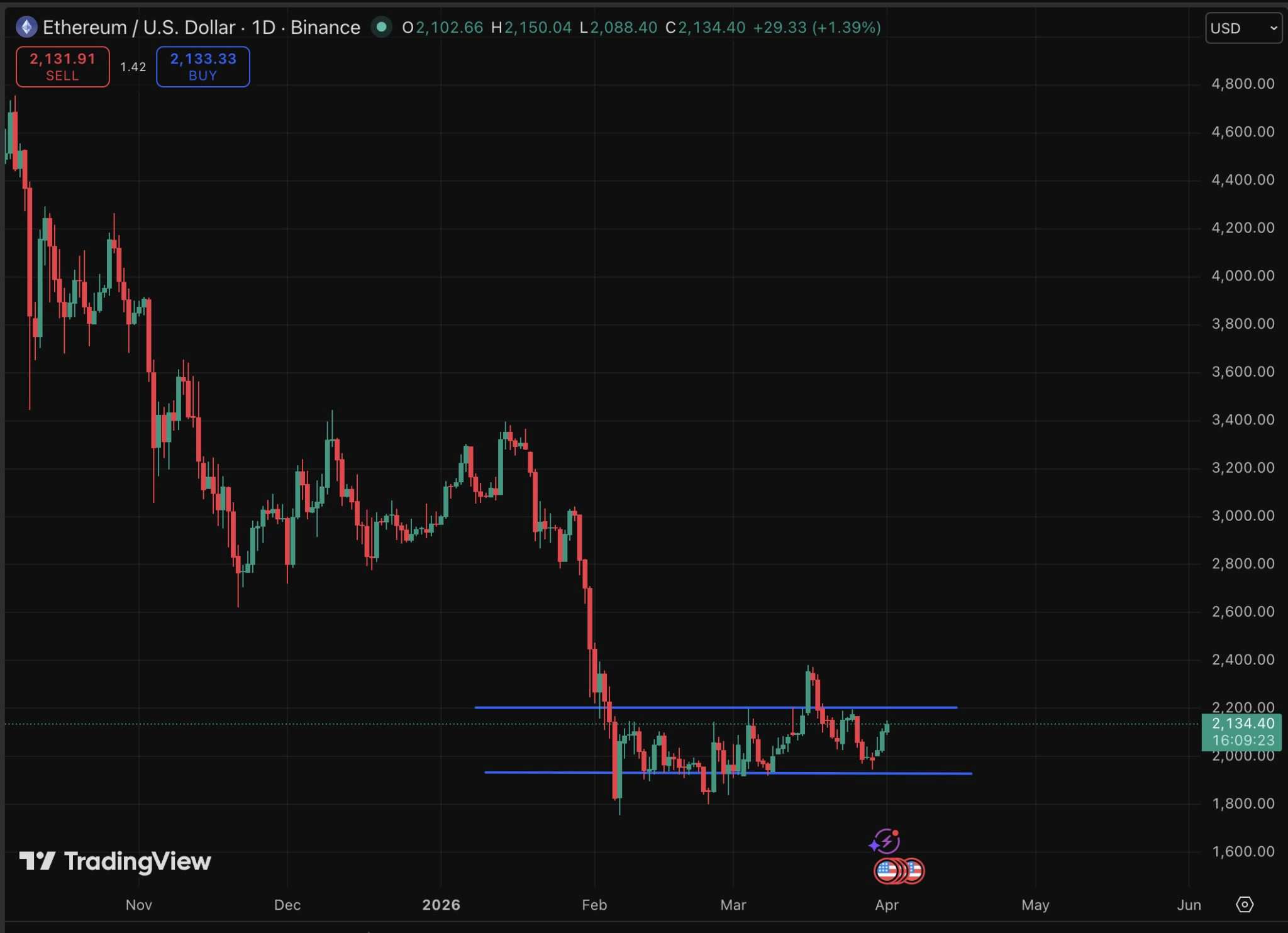 ETH is currently consolidating in the $1950–$2200 range, with the 24-hour range showing cautious accumulation rather than strong buying. The recent decline Ethereum to lower-than-expected levels suggests that the asset needs to break resistance at $2800 before talk of a recovery can become meaningful.