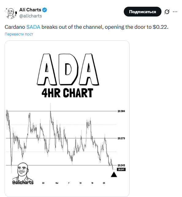 Prix ​​du 30 mars Cardano (ADA) pourrait connaître une nouvelle vague de ventes, car une clôture hebdomadaire en dessous de 0,245 $ ouvrirait la voie à une possible baisse de 11 % à 0,22 $. analyste croit Ali Martinez.