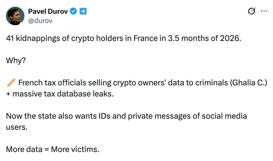 - Pavel Durov stated that 41 crypto investors were kidnapped in France over the first 3,5 months of 2026.