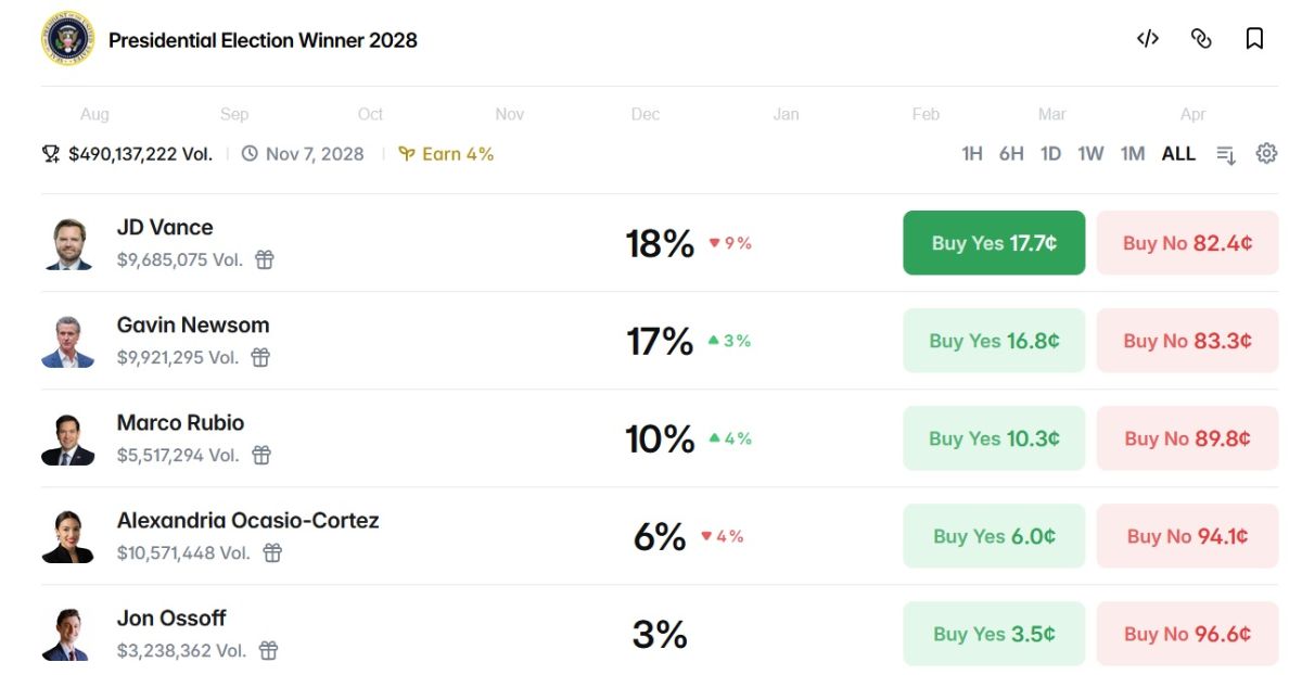 The probabilities of winning the 2028 US presidential election for different candidates
