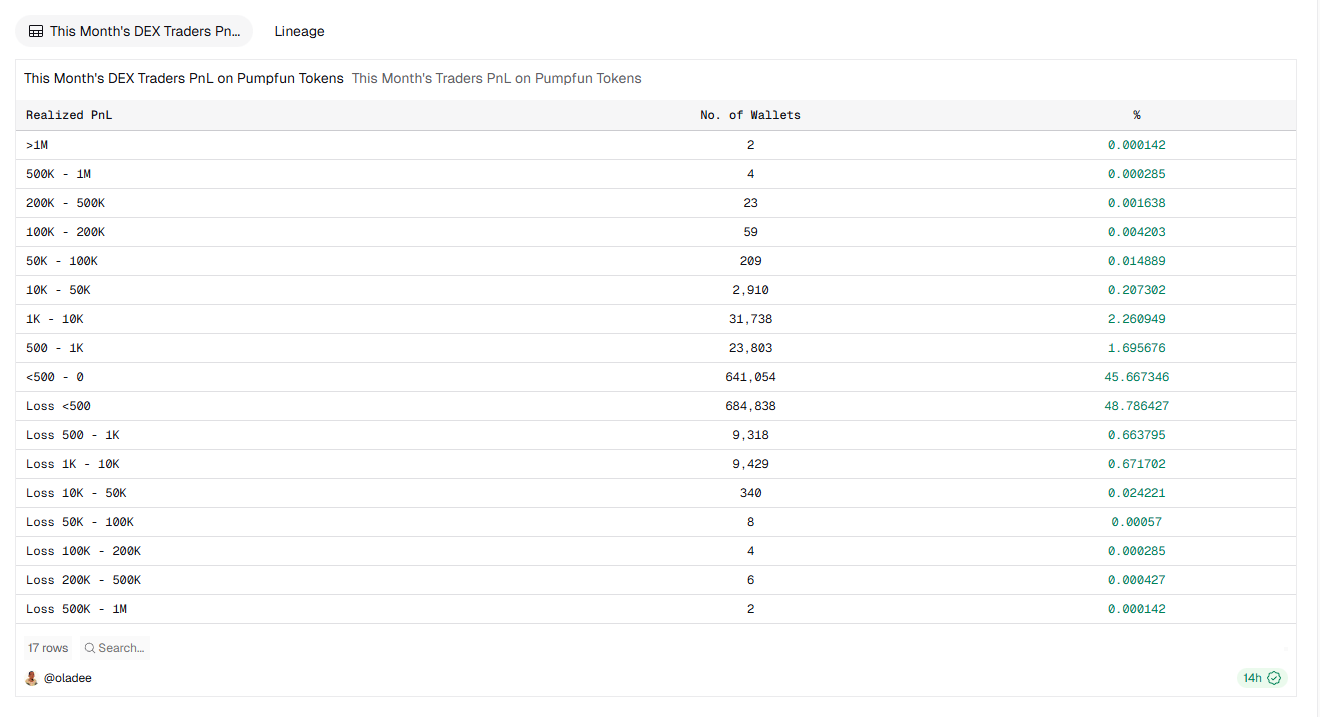 Two wallets, on the other hand, earned over $1 million last month trading Pump Fun tokens, while two users lost between $500,000 and $1 million. It’s worth noting that individual traders can create multiple wallets.