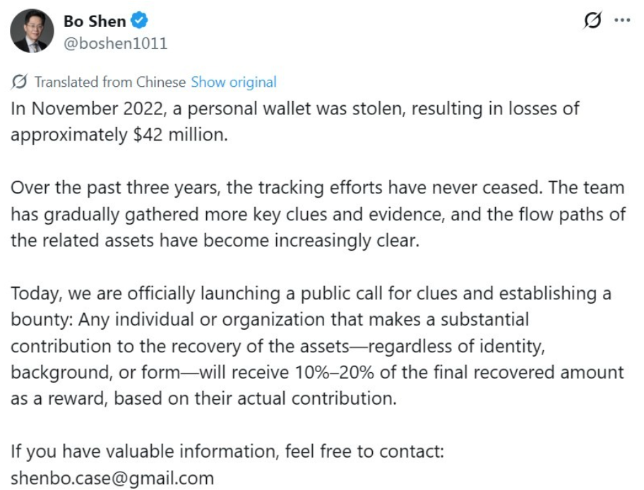 Bo Shen, cofondateur de la société de capital-risque Fenbushi Capital, offre une récompense pour la restitution de près de 42 millions de dollars en actifs numériques. Ces fonds ont été dérobés de son portefeuille crypto personnel lors d’un piratage en 2022.
