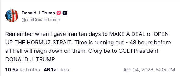 Vous vous souvenez quand j’ai donné dix jours à l’Iran pour CONCLURE UN ACCORD ou OUVRIR LE DÉTROIT D’HORMUZ ? Le temps presse : 48 heures avant que tout ne bascule. Dieu merci !