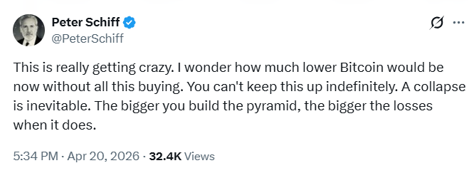 L’économiste renommé et critique du Bitcoin, Peter Schiff, a déclaré que sans les achats massifs de BTC, son prix serait bien inférieur. Il a averti qu’« un krach est inévitable ».