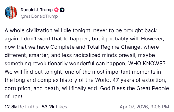 Ce soir, une civilisation entière périra, pour ne jamais renaître. averti Trump