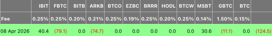 Les injections de capitaux dans IBIT et MSBT n’ont pas suffi à compenser les sorties de capitaux des autres fonds – d’après Fidelity Wise Origin Bitcoin Fonds (FBTC) et ARK 21Actions Bitcoin ETF Les investisseurs d’ARKB ont retiré respectivement 79 millions et environ 75 millions de dollars. Grayscale Bitcoin Confiance ETF (GBTC) a perdu 11 millions de dollars, portant le total des sorties de fonds quotidiennes des marchés au comptant américains à [montant manquant]. ETF Bitcoin ce montant s’élevait à 124,5 millions de dollars, selon Selon Autre côté.