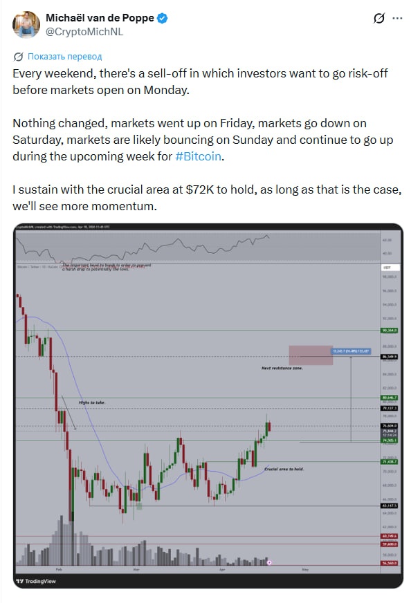 L’analyste a également identifié le niveau de 72 000 $ comme une zone de support clé, dont le maintien au-dessus permettra de préserver la dynamique haussière.