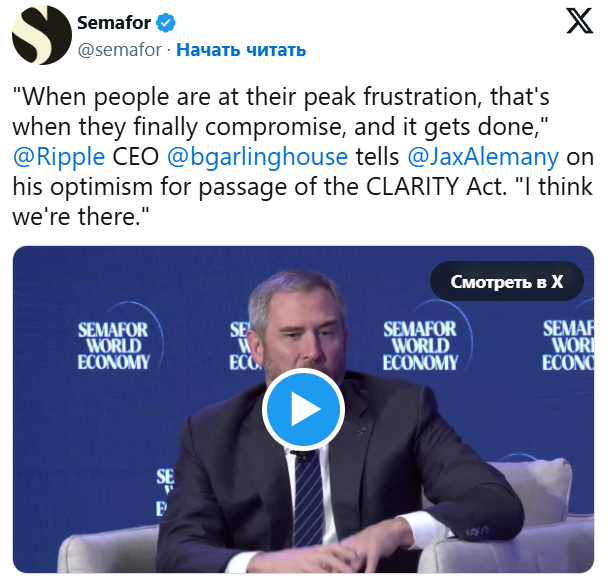 PDG de l’entreprise Ripple Brad Garlinghouse estime que la longue bataille autour de la loi CLARITY touche à sa fin. Il a déclaré : dit, s’exprimant lors du forum économique Semafor.
