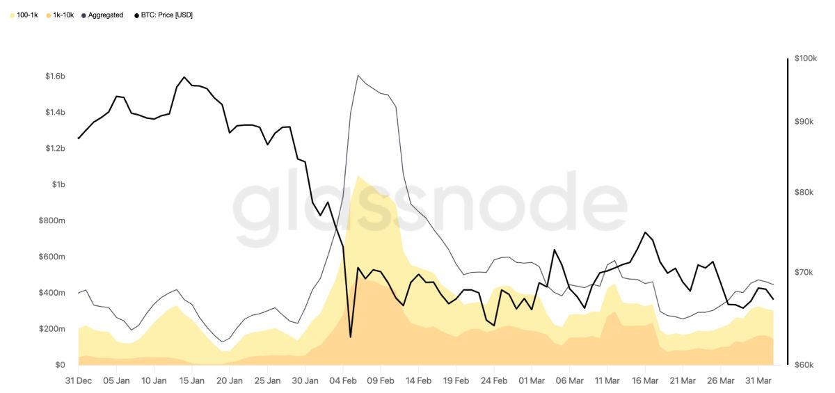С января по март текущего года акулы, которыми называют владельцев от 100 до 1,000 BTC стоимостью от $6,7 млн до $67 млн по текущему курсу, теряли в среднем $188,5 млн в сутки, избавляясь от цифровых активов. А киты, хранившие от 1,000 до 10,000 биткоинов на сумму от $67 млн до $670 млн, уходили в минус на $147,5 млн. Таким образом, каждый день состоятельные инвесторы лишались $336 млн.