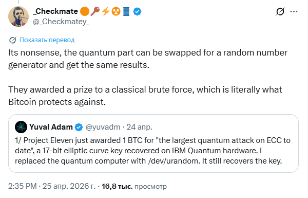 Independent developer Yuval Adam reproduced The described method, substituting random values ​​for quantum data, also succeeded in recovering identical keys. This experiment suggests that the obtained result is based on classical brute-force methods, and not on any quantum computing.