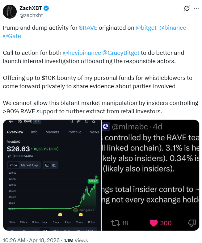 In a post on social media X, he stated that the activity originated on the Bitget exchanges, Binance and Gate, and called on the platforms to investigate the trade and remove all those involved. Zach XBT also said insiders control more than 90% of RAVE, raising new concerns about market integrity and risks for retail investors.