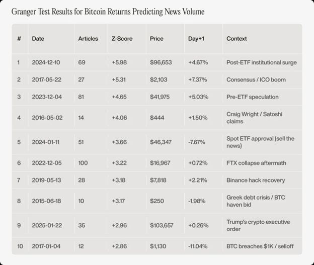 Более глубокий анализ доказывает, что криптоновости, которые рынок привык воспринимать как сигналы, не задают прогнозируемый вектор для дальнейшего движения биткоина. Авторы отчёта изучили эту связь с помощью: